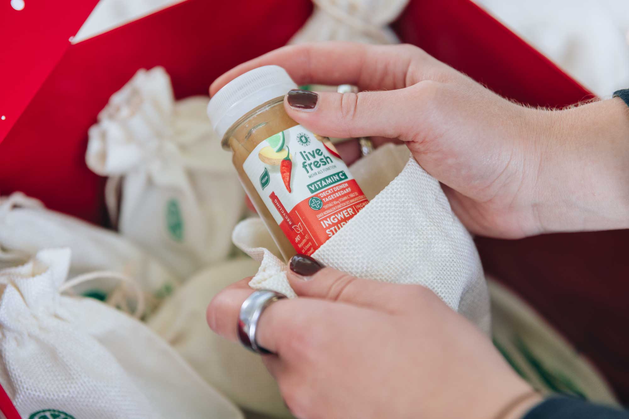Der Versand unseres LiveFresh Adventskalenders beginnt Mitte November, damit alle Produkte frisch und in bester Qualität bei Dir eintreffen. Um die Haltbarkeit und Frische zu gewährleisten, sollten alle Säckchen im Kühlschrank bei maximal 8°C gelagert werden, da der Adventskalender ausschließlich kühlungsbedürftige Säfte und Shots enthält. Bitte beachte, dass einige Produkte zerbrechlich sind. Öffne und lagere die Säckchen daher besonders vorsichtig, um Beschädigungen zu vermeiden und jeden Tag ein unversehrtes Geschmackserlebnis zu genießen.