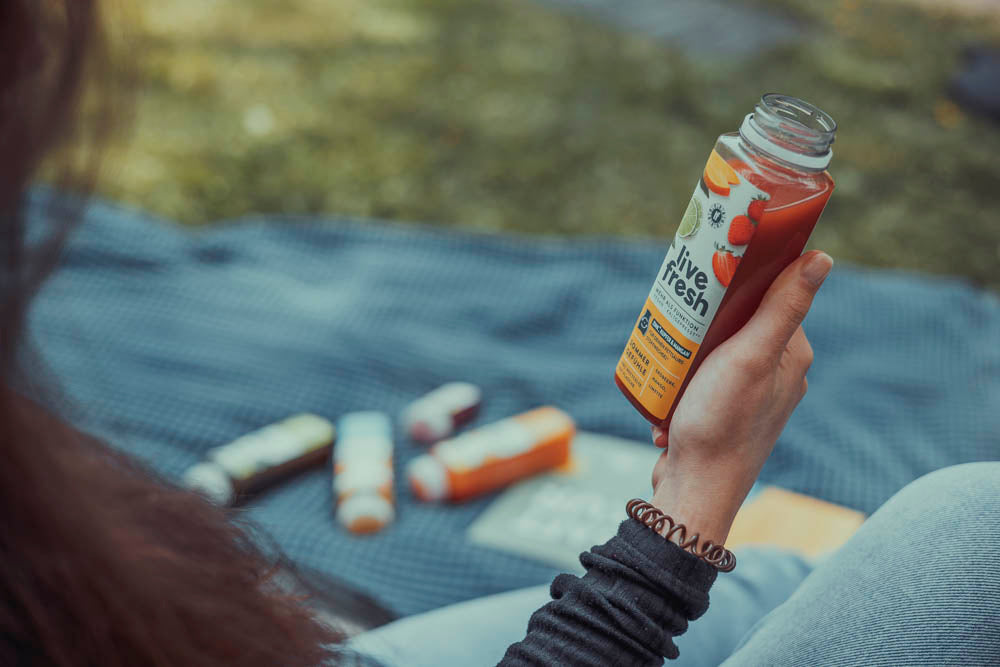 Hinter LiveFresh steckt ein kleines Start-up vom Bodensee, das zu 100 % hinter der Qualität und Frische ihrer Produkte steht. Herkömmliche Säfte sind häufig pasteurisiert und verlieren dadurch wertvolle Vitamine & Geschmack. Im Gegensatz dazu werden die LiveFresh Säfte kaltgepresst, also keiner schädlichen Hitze ausgesetzt. So bleiben wichtige Nährstoffe & Vitamine erhalten – und das bei vollem Geschmack. Zudem legt LiveFresh großen Wert auf Nachhaltigkeit: